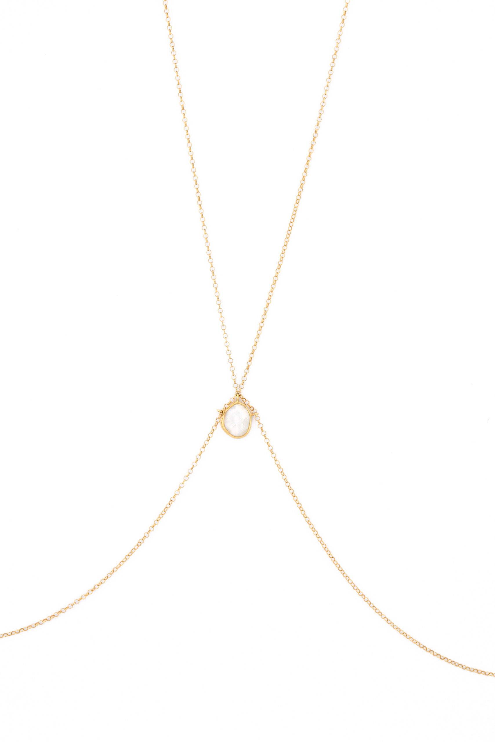 - El Bodychain Ayla destaca por su elegancia etérea con una hermosa piedra luna facetada en el centro, conocida por su poder para equilibrar emociones y fortalecer la intuición.